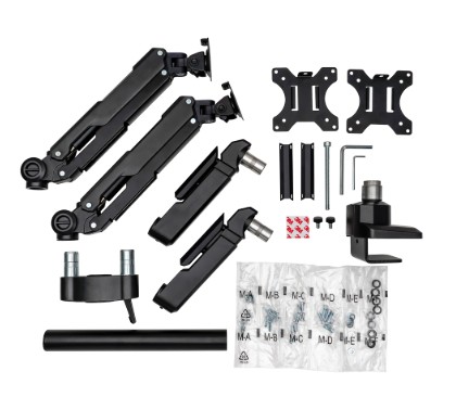 製品内容 アーム1x2、アーム2x2、ポール、ポールスタンド、VESA金具(75x75mm/100x100mm)x2、 VESA金具固定用ネジx2、アーム固定金具、ケーブルガイドx2、グロメットパーツ、六角レンチ(3mm/6mm)、保護シールx4、M4-12mmネジx8、M4-16mmネジx8、M6-12mmネジx8、M6-16mmネジx8、ワッシャー(小)x8、ワッシャー(大)x8、 取扱説明書 兼 保証書