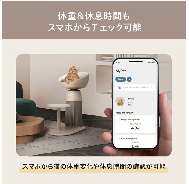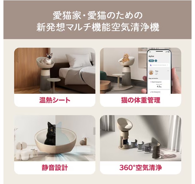 ペット由来のニオイやアレル物質などを強力に除去する優れた空気清浄機能だけではなく、本体上部に搭載した温熱シートは猫の体重を測定・記録する健康管理機能を備えており、猫と暮らすオーナーに最適な1台です。