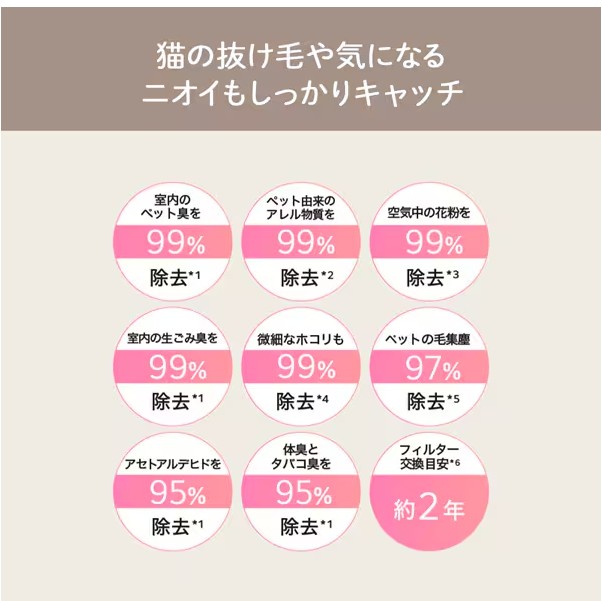 アレル物質、ペット臭、空気中の花粉の99%除去