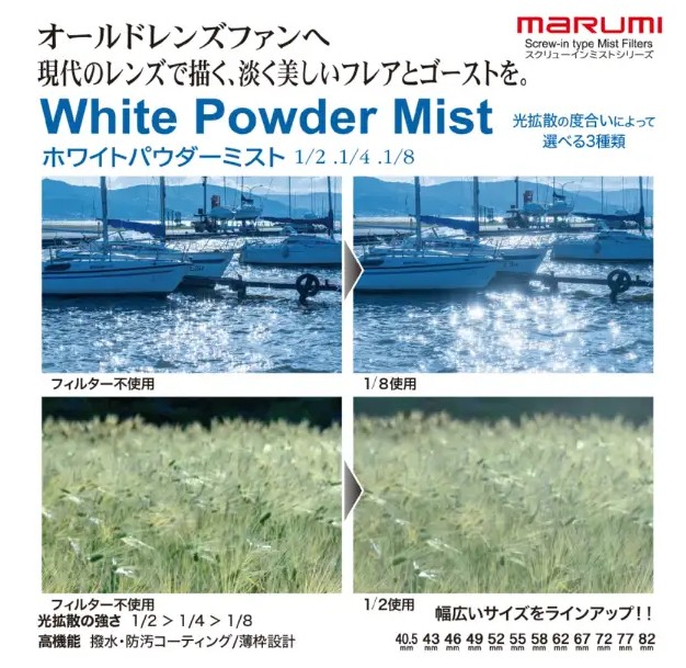 ガラスの内面に微細な白い拡散材を施したフィルターで、ブラックミストとは異なる、独特の光の表現を可能にしました。光をより強く拡散させ、全体をふんわりとトーンアップさせることで、より幻想的で、光に包まれるような描写を実現します。拡散効果の強さのちがう、1/8、1/4、1/2の3種類の濃度をご用意しました。