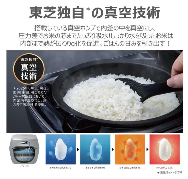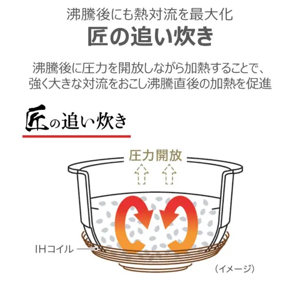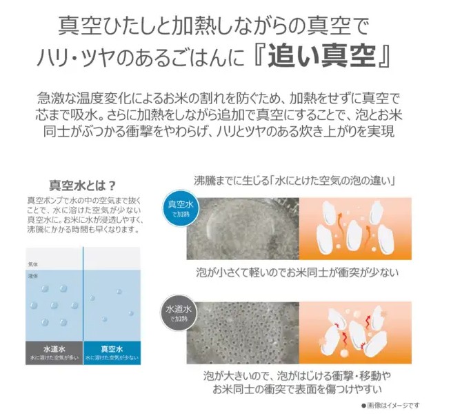 「真空圧力IH」 真空0.5~気圧(保温時0.6気圧)、圧力1.2気圧(圧力可変)真空保温40時間