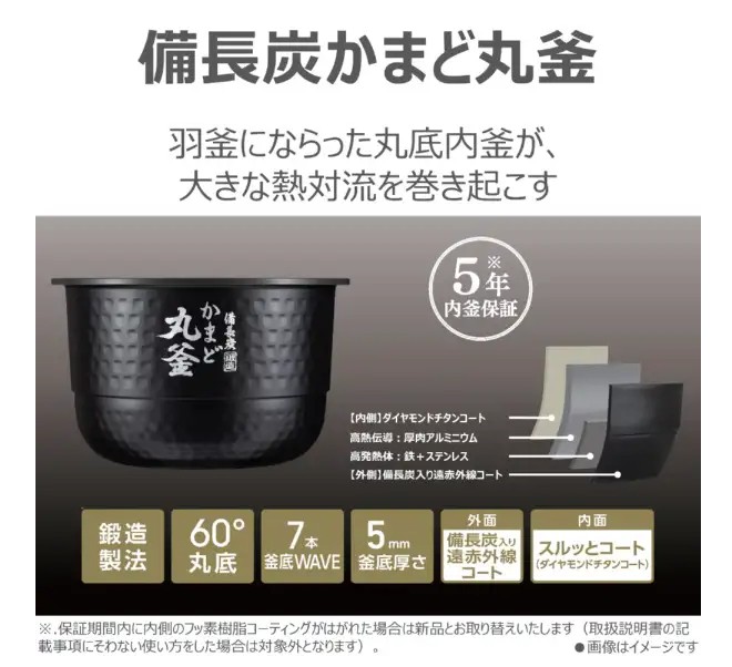 内釜仕様 鍛造内釜/外面コーティング:備長炭入り遠赤外線コート/内面コーティング:スルッとコート(ダイヤモンドチタンコート)/厚さ(釜底):5㎜/釜底WAVE:7本/内釜保証:フッ素樹脂コーティング5年保証