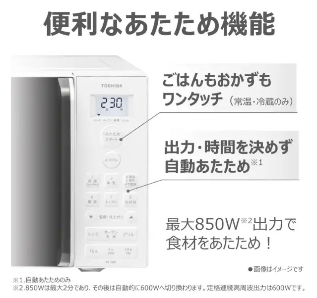 レンジ出力 850W(最大2分)その後は、600Wへは自動的に切り換わります。定格連続高周波出力は600Wです。 / 600W・500W連続 / 200W相当