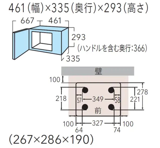 庫内寸法(幅×高さ×奥行)mm W267×H190×D286