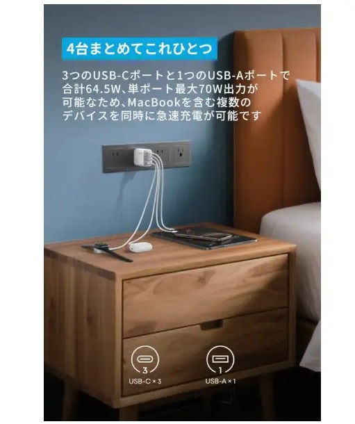 定格出力電力 単ポート使用時:USB-C1 / 2 / 3 : 5V=3A / 9V=3A / 15V=3A / 20V=3.5A (70W Max) USB-A1: 5V=3A / 9V=2A / 12V=1.5A / 10V=2.25A (22.5W Max) 2ポート使用時:67.5W Max 3ポート使用時:64.5W Max