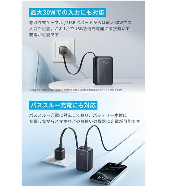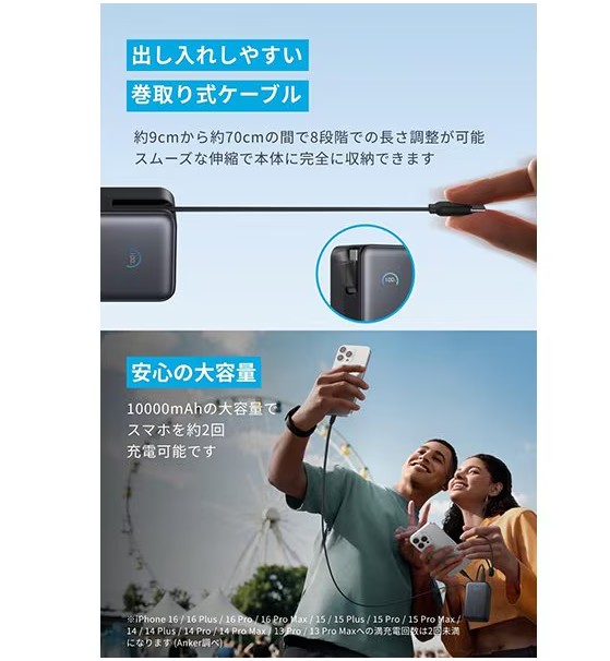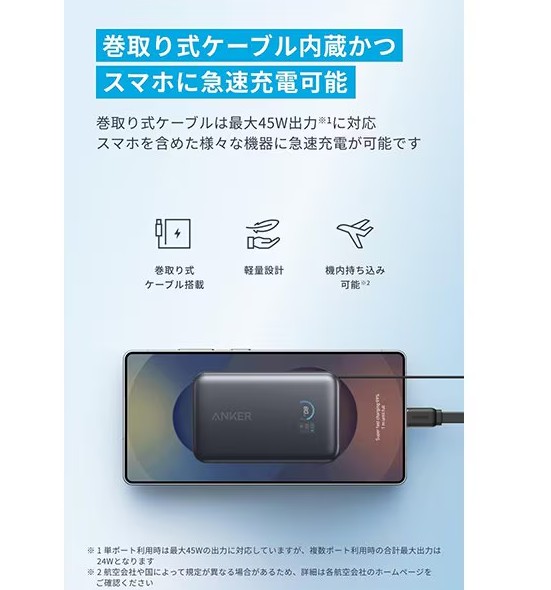 A1638N11 モバイルバッテリー Nano Power Bank 10000mAh 45W 巻取り式 USB-Cケーブル ブラック A1638N11 USB Power Delivery対応 /2ポート アンカー・ジャパン Anker Japan
